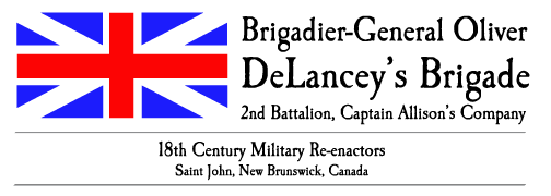 The uniform of DeLancey's Brigade in 1783 was a red wool regimental coat with dark blue facings, white wool breeches and waistcoats, black cocked hats and donation cloth leggings. This is the uniform recreated by the re-enactment unit in Saint John. Earlier in the war DeLancey's, like many of the Loyalist units, wore a green uniform.
